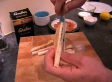 Preheat your oven to 200c then you can get on and make the melba toast. This will take about 4 minutes in the oven, by which time everything else will be done. Take your toast and cut the crusts off to form a square. Now this is the only tricky bit. Using a large knife, slide the blade gently into the soft middle part of the toast that will have been exposed by cutting the crusts off. Slowly and gently, run the knife through the toast (as pictured below), so that you cut it in half, with each half having one toasted and one untoasted side.