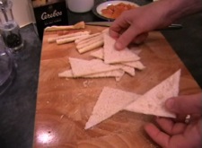 It's really easy once you get the hang of it. Cut each half across the diagonal to create four triangles. Place all the triangles on a baking tray, toasted side down and bake in the oven for 4 minutes until they curl up and go golden brown.