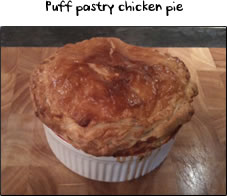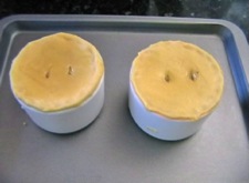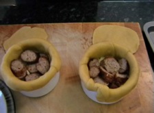 Put 1-2 dessert spoons of mash at the bottom of each pie, then layer the sausages on top. Spoon in the gravy in, leaving a gap of about 1cm from the top of the ramekins so that you have room to put your lids on. Place your pastry lids on top, then pinch the overhanging pastry together to make a good join. Do this all the way round the top of both pies, then trim away any excess with a knife.
