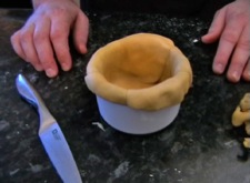 Whilst the potatoes and onions are cooking, roll out your pastry. Lightly flour your work surface then roll out a rough circle that's approximately twice the size of the ramekin and about half a cm thick. Gently ease the pastry into the first ramekin and press into the base to get a nice flat bottom to your pie. Press firmly against the sides of the dish to flatten the pastry and create a nice pie shape! Trim off any excess, leaving about 1cm of pastry overhanging the top. Gather up the pastry in a ball and roll it out again, this time to create the pie lid. Use the base of the ramekin as a size guide, but make the pastry lid about 1cm bigger than the ramekin. Repeat for the other dish so that you have two ramekins lined with pastry, with two lids set aside.