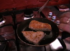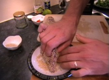 The tuna should be done now, so turn the heat off and pop them on a board. Add the dressing to the salad and then toss together with your fingers to get it all nicely coated.