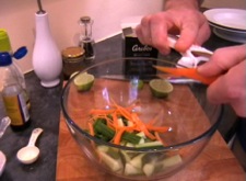 Put one teaspoon of both rice vinegar and soy sauce into your small bowl or jar. Add in the chillies and the juice of half a lime. Lastly add in 3 tablespoons of the oil and whisk or shake together. Set this aside whilst you assemble the salad. Take your large mixing bowl and add the coriander, cucumber and spring onion. Using your potato peeler, peel strips of carrot into the salad.