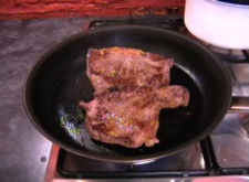 Next add the cabbage into the boiling water and cook for 1 minute. It should now be about time to turn the steaks, and they should be nice and caramelised. Drain the cabbage and bring it back over to the hob. The steak should be cooked medium now, so remove to a board to rest.