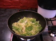 Bring in your other pan/wok and put it on a high heat. When the pan's hot, add a little swirl of oil and throw in the cabbage. Next add in the single cream and a pinch of salt and pepper. give it a good stir and allow it to come to the boil. When the cream starts boiling, turn the heat off and take your pan over to the work surface.