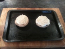Bring in the large mushrooms now and spoon the mixture on top of them. Press down with the back of your spoon to spread it out and then sprinkle with the breadcrumbs.