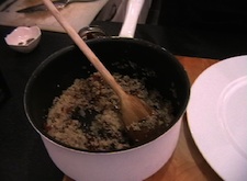 Take the tray out from under the grill and take the lid off your pan of couscous. Put the pan back on the hob on a low heat. Chop the mushroom as finely as you can and do the same with 4 or 5 sun dried tomatoes. Add the tomatoes and chopped mushroom to the couscous pan and stir well. Remove from the heat.