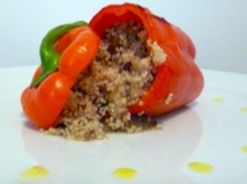 All that's left to do is to stuff the peppers. If you are having a casual barbecue then just dollop the couscous in and get back outside to the sunshine. If you're serving as part of a meal, then carefully stuff the pepper, place on a plate with the pepper top balanced next to it and carefully drop some extra virgin olive oil around the plate to look pretty!