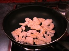 Turn on your frying pan/wok on a high heat and whilst it's heating up, season the chicken with a small pinch of salt & pepper. When your pan is nice and hot, add a teaspoon of oil and add in the chicken. Cook this for 4 minutes, turning the pieces of chicken occasionally to ensure that any pink uncooked bits get turned to face the heat.
