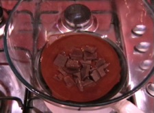 Put a small saucepan on the hob with about an inch of barely simmering water. Break the dark chocolate into small chunks and add to your glass bowl. Sit the bowl on top of the saucepan for 8-9 minutes until the chocolate is around 90% melted. The only things to be careful of here are not to allow the bottom of the bowl to touch the water, and not to allow the water to rapidly bubble - it should just be simmering.