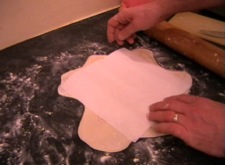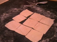 Lightly flour your work surface and place the pastry on top. Lightly dust your rolling pin with flour and then start rolling out the pastry into a large square, roughly the size of a piece of kitchen roll. Pick the pastry up and turn it over every few rolls to check that it doesn't stick. Roll the pastry as thin as you can get it without breaking. Once it is roughly rolled out, use a piece of kitchen roll as a template to cut out a large, neat square.