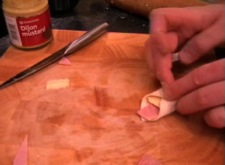 Now, it's time to build the turnovers. Cut a strip of ham about an inch wide and the same length as one of the squares. Spread a little dijon mustard onto a pastry square and lay the ham diagonally across it from corner to corner. Cut a small chunk of cheese and place on top of the ham.