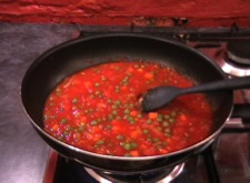 Put your large frying pan/wok on the hob on a high heat then add a teaspoon of oil. Add in the onion, garlic, celery & carrot and cook for 2 minutes, stirring to avoid anything burning. Add the other ingredients, one at a time, stirring each time: 1 tablespoon of tomato puree, a tin of chopped tomatoes, 1 tablespoon of worcestershire sauce, 1 tablespoon of red wine vinegar and the same of sugar. Lastly, throw in the peas and season with a good pinch of salt & pepper. Half fill the empty tin of chopped tomatoes with cold water and pour this into the pan. Bring the pan up to the boil and then simmer vigorously for 5 minutes.
