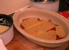 Turn off the hob under the tomatoes and it's time to build your lasagne. Add a thin layer of the tomato sauce to the bottom of the ovenproof dish then cover with a single layer of lasagne sheets. Don't worry about how it looks - break the sheets to fit your dish if necessary. Next, pour a layer of white sauce over and spread it out with the back of a spoon. Add the rest of the tomato sauce and spread with a spoon. Add another layer of lasagne sheets, then finally your cheese sauce on top! Pop the dish in the oven for 35 minutes and leave to rest for 10-15 minutes before serving.