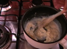 Next, add a small splash of milk and stir it in. Once the milk has been stirred in, the flour and butter should come together into a ball. At this point, add another dash of milk and repeat the process. Keep doing this - each time you should be able to add a little more milk than the time before, as the mix loosens a little. The key to avoiding lumps is to add a little at a time. Persevere until all the milk has been poured in and you have a nice thick sauce.