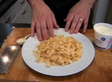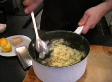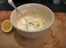 For the sauce, put 4 tablespoons of creme fraiche into a small bowl together with the zest of the lemon and the juice of half the lemon. Using a fine grater, grate in the parmesan in, before adding a small pinch of salt and pepper. Stir thoroughly to mix all the ingredients together well.