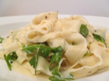 This is the ultimate quick dish - really tasty and a favouite in our house. Fresh tagliatelle is bound together with a zingy sauce of creme fraiche, lemon zest and parmesan. Wilting rocket is thrown in at the end to finish a dish that only takes 6 minutes to cook!